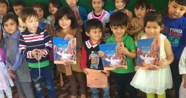 In photo: Local children joyfully receive books from HADIA Foundation's mobile library that travels villages