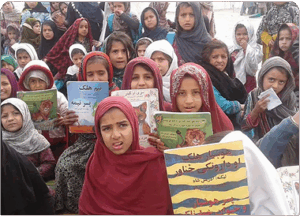 In photo: Girls in rural Afghanistan receive books from HADIA's mobile library
